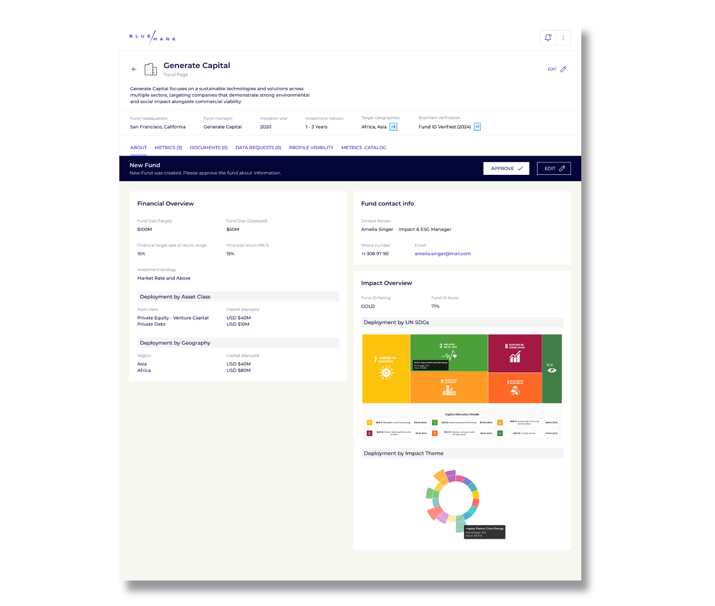 The resulting solution is a convenient, robust web-based platform that offers a fund directory, monitoring, portfolio review, and client management functionalities. Investments can be sorted and filtered by status, impact theme, asset type, and geography. There is a clear display for requests that are waiting for approval. The metrics to display are configurable within the system, while data visualization tools provide easy access and analysis of the data.