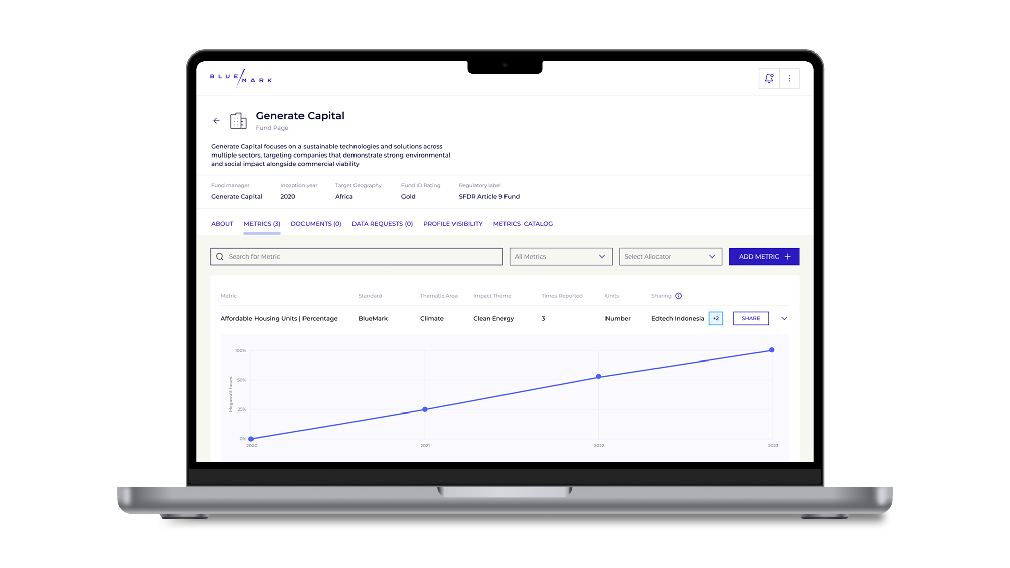 BlueMark is a global provider of independent impact verification and intelligence for the sustainable and impact investing market. Their mission is to strengthen trust and transparency by means of verification services, benchmarking, and analytics – providing information about how investors manage and report the beneficial impact of their investments. Since 2020, BlueMark has completed hundreds of verifications, now streamlining the access to their work through the BlueMark IQ platform: a solution that helps asset managers, allocators, and other stakeholders understand, compare, and communicate impact performance.