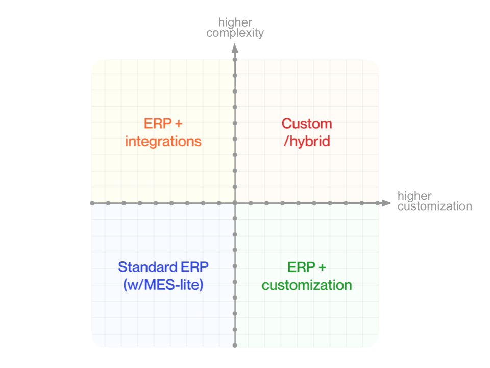 Strategically, choosing any of these approaches involves a sort of trade-off between complexity (how many manufacturing operations, systems, and connections the ERP must handle) and customization (how much the ERP must be adapted to unique processes).